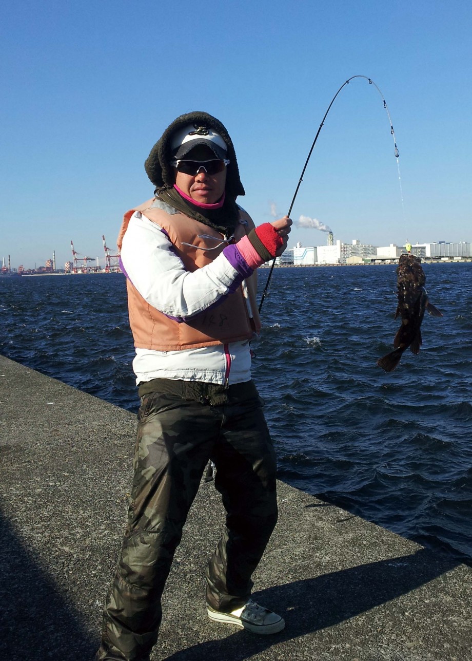 「シーバスって意外と釣れないんだね〜」っと話してきたり、休憩も増えて来たので、もしかして「ちょっと飽きちゃったかな〜」って思いつつも、再度シーバスフィッシングは、とにかく投げなきゃ始まらないので、ルアーセレクト&ローテーション、レンジ、方向やヒットするイメージを頭に浮かべながら、色々なアクションを入れ、巻き上げるように教えましたが、ちょっと気分転換にカサゴ釣りを教えて上げました。新堤の1月〜2月は、やはり渋いので、こういう事もあるだろうと思ったので、ソリッドロッドを用意してました。