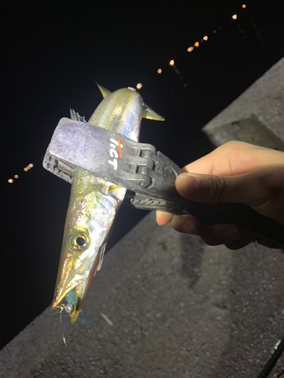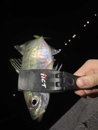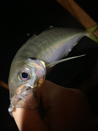 これでセットが完成です、ここからキャストをして20カウントしたところで、リフトアンドホールとストップアンドゴーを混ぜ込みながらアクションしていくと、駆け上がりの所でごツンと当たりがあり、すぐさまロッドを上げ、ドラグを立てながら走って行きこれでヒットです!取引しながら手前に寄せてきた所でロッドのバットを手で押さえながら上げてくるとアジの24cmゲットです!これを繰り返していくと、ネンネン(ネンブツダイ)も釣れカマスの25cmクラスがヒットしました!