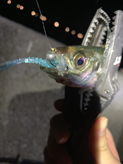 TICTさんから出ているメーテルミニを回転式サルカン8号を上下につけメーテルの頭は道糸に続いてるリーダーに結び、メーテルの下側はフロロショックリーダー0.8号を60cm〜65cm取ってTICTさんのアジスタ0.6g結び、ワームはギョピン1.7インチの銀粉入りシラスを使用しました!