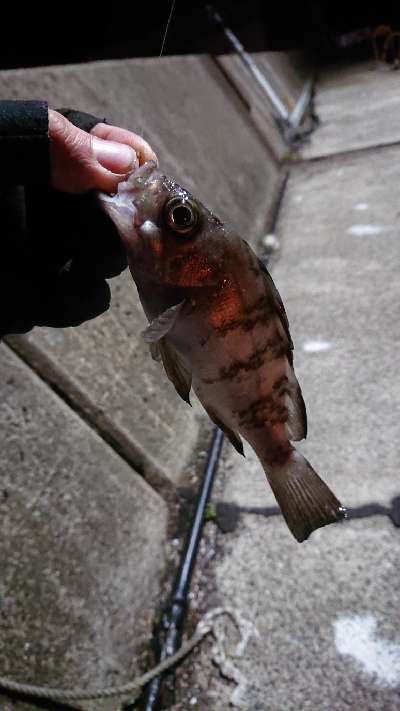 結構潮も流れてていい感じだったので、港の外側の明暗の境目の表層をゆっくり誘うと、一投目からメバルが釣れました。