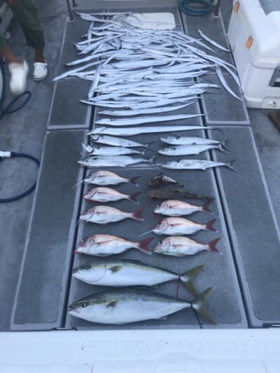 2018年9月23日2018年9月17日 今回は釣り仲間のチャーターでシーライドに乗りました。紀淡海峡でジギング/鯛ラバ。青物は活性低く難しかったですが、タチウオ調子よく、一人平均十匹ぐらいゲット。写真は船全体の釣果ですが、僕はその内ジギングでサゴシ一匹と鯛ラバで真鯛3をゲット。
