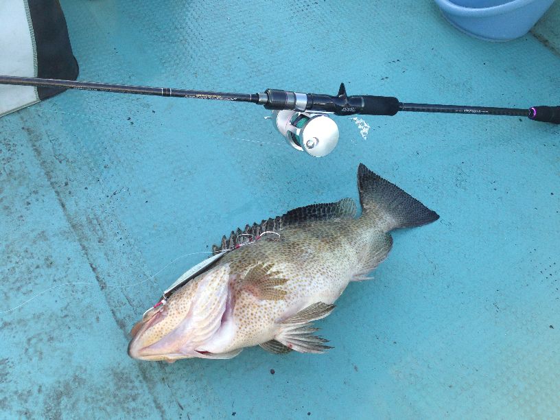 キター!!ようやく釣れたハタ系。宝石ハタ?オオモンハタ?どちらかわからんが、数年通ってようやく釣れたハタに、2人で大コフーンです(^。^)