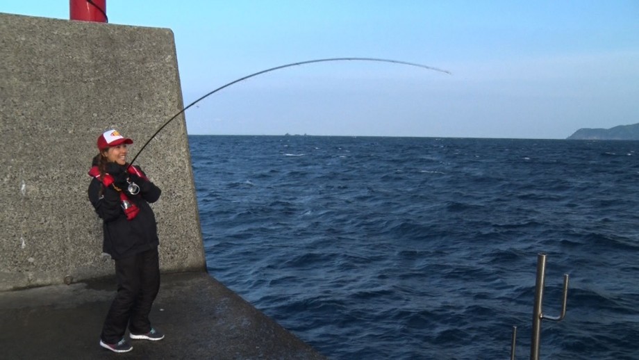 爆風の中、新アイテム「ジグパラTG」を使って、次々に釣果をあげていく2人。