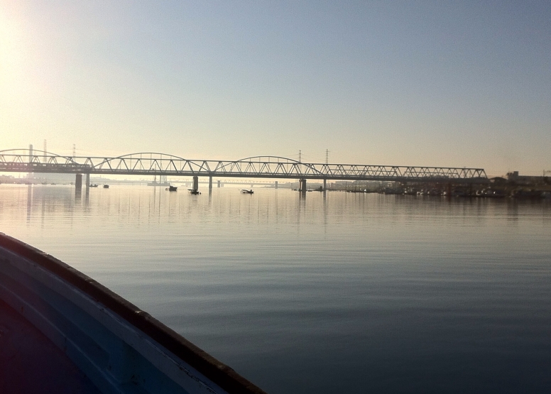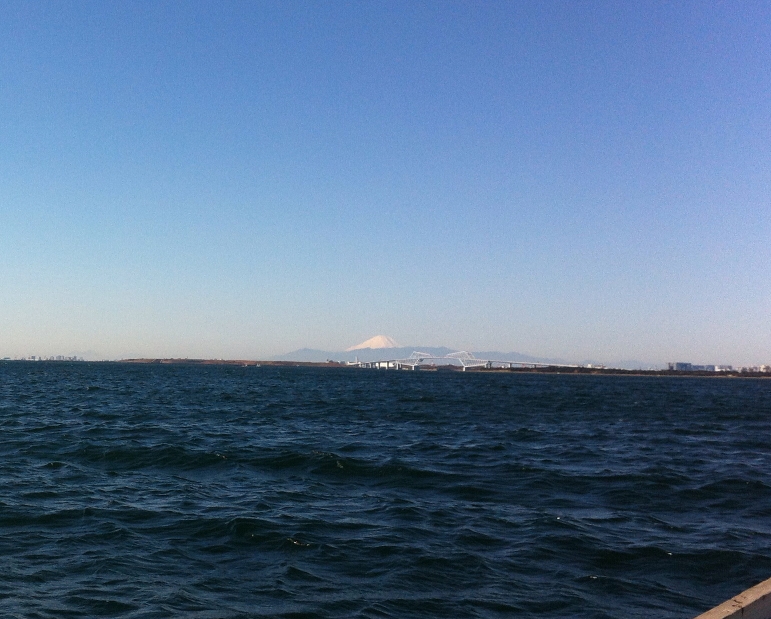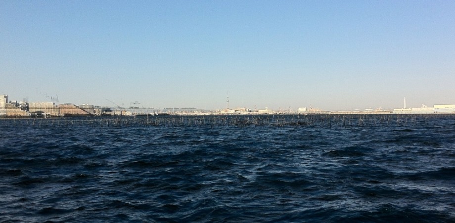 遠くにスカイツリーが見えました、手前は海苔の養殖場所です。