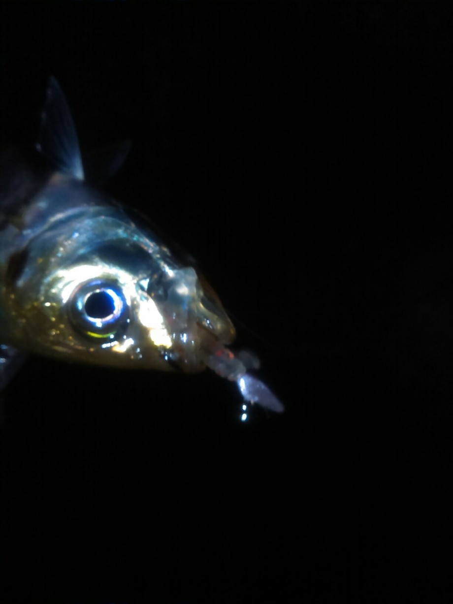 0.75gで表層でバイトがあり、釣り上げますが食い込みが悪いようです。