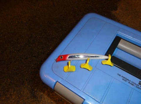 それから波が若干あるし、もう少し下を通すようRB77で。この港の定番ルアー。