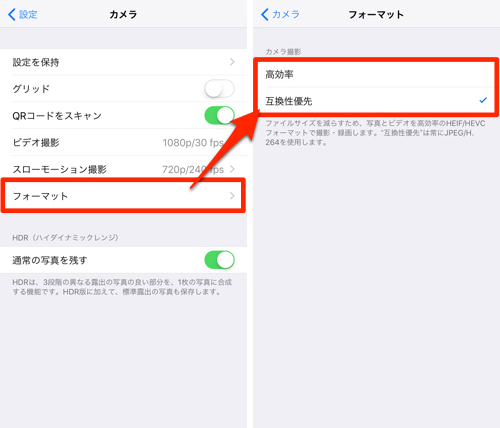iPhone7以降の機種、かつiOS11では標準カメラアプリで撮影する写真(画像)のフォーマットとして高効率と互換性優先が選べるように仕様が変更になりました。