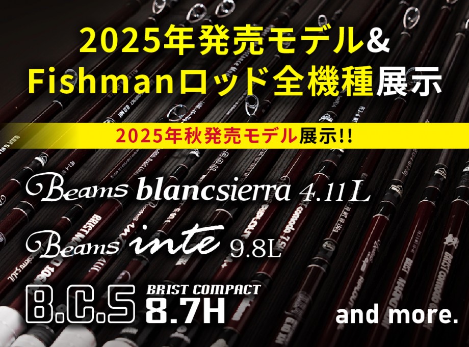 2025年秋新作ロッド『BC5 9.6MH』『Beams inte9.8L』『Beams blancsierra4.11L』&既存のFishmanロッド全機種を一挙に展示!