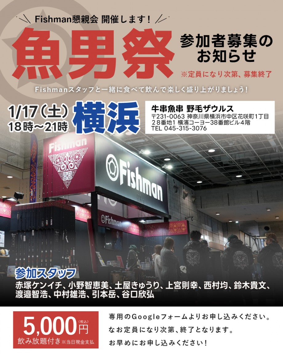 ※ご回答いただいた時点で受付完了となります。キャンセルの場合は1/9(金)18:00までにFishmanお問い合わせフォーム(https://www.fish-man.com/form/)またはメール(customer@fish-man.com)にてご連絡ください。