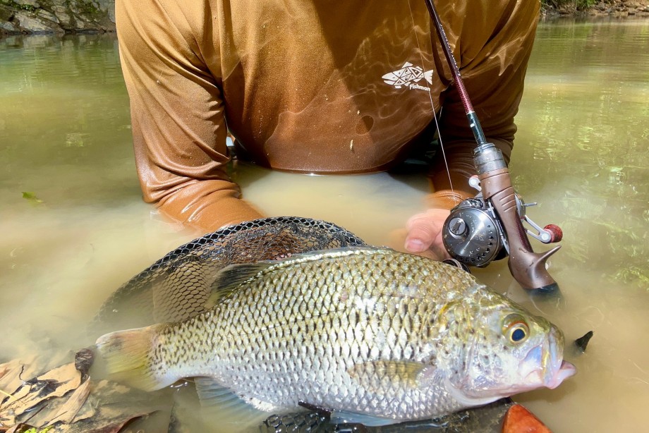 一瞬でティップからベリーまで一気に引きずり込む、良く引くジャングルパーチ。バットまで曲げ込みロッド全体で受け止める綺麗なベント。ゆっくりしっかり寄せて、マッディーな水色から波紋とともに割って出てきたサイズは立派な40cmオーバー!