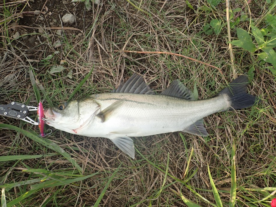 何投目かに、水中には3,4本の木の杭が刺さっている場所の際を狙うと、どんとヒット。ガッツリフッキングしているのでばれる心配はなさそう。ゆっくり引きを楽しんでゲット49cmのレギュラーサイズ。