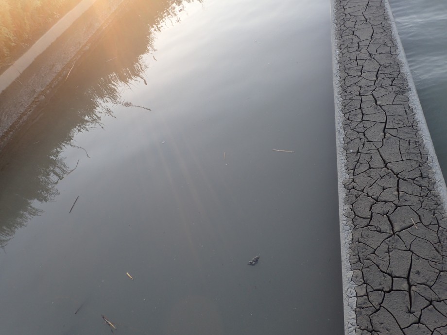 大雨が降ったあとに近所の河川中流で釣りをやってみた。左は、遊歩道になっているが7,8cmほどの汚泥が積もっており、長靴でないと釣り場所に立てない。