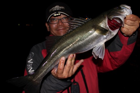 外灯の色のせいもあるかも知れないが、背中が白い(白っぽい)スズキ。