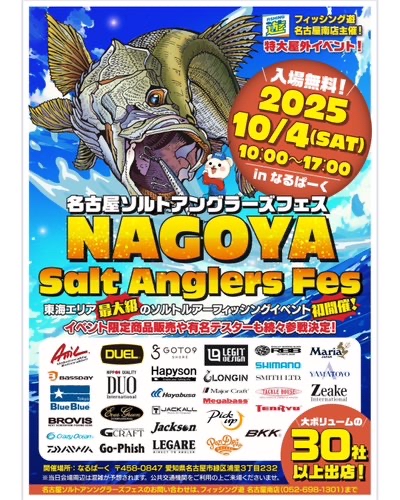 秋のイベントシーズンが開幕し、先日の『エンジョイ魚まつり2025』に続き、イベント第2弾として 『名古屋ソルトアングラーズフェス』のご案内をさせて頂きます。