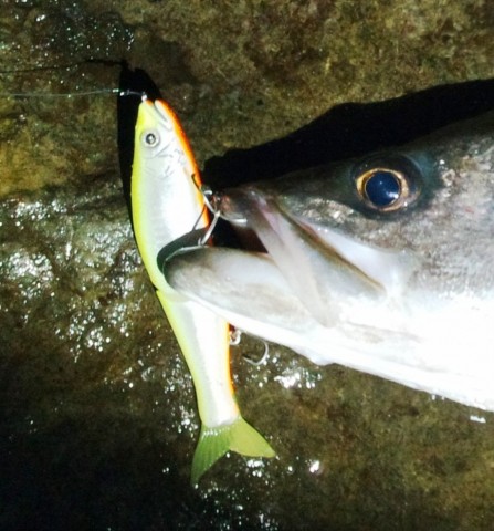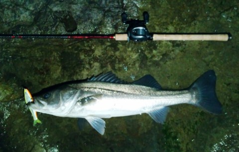 クリアな潮色と月明かり的に、ミスマッチかなと思いつつも、この日持ち込んだジョイントベイト2本のうち、飛距離とアピール力で勝る(と思ってい る)AIMSxGAN CRAFT ジョインテッドクロー148改のサイドがホロ、チャートバックにオレンジべリーのスローシンキングタイプをこれまで、何度も通してきたリトリーブコースを引けるようにフルキャスト。風と潮でより岸寄りに送り込むイメージで待ってから、スローにストップ&ゴーをラインをたるませながら繰り返し、一番のプロダクティブゾーンと思っている、自分が乗っている岩から続く根の一番深く掘られたスリット沿いに差し掛かったところで、軽くコンッと、次いでググッと。