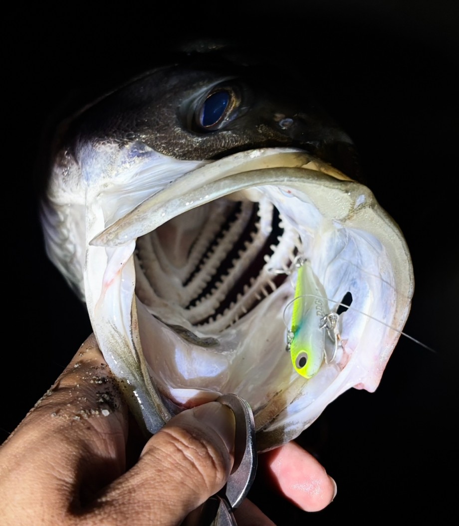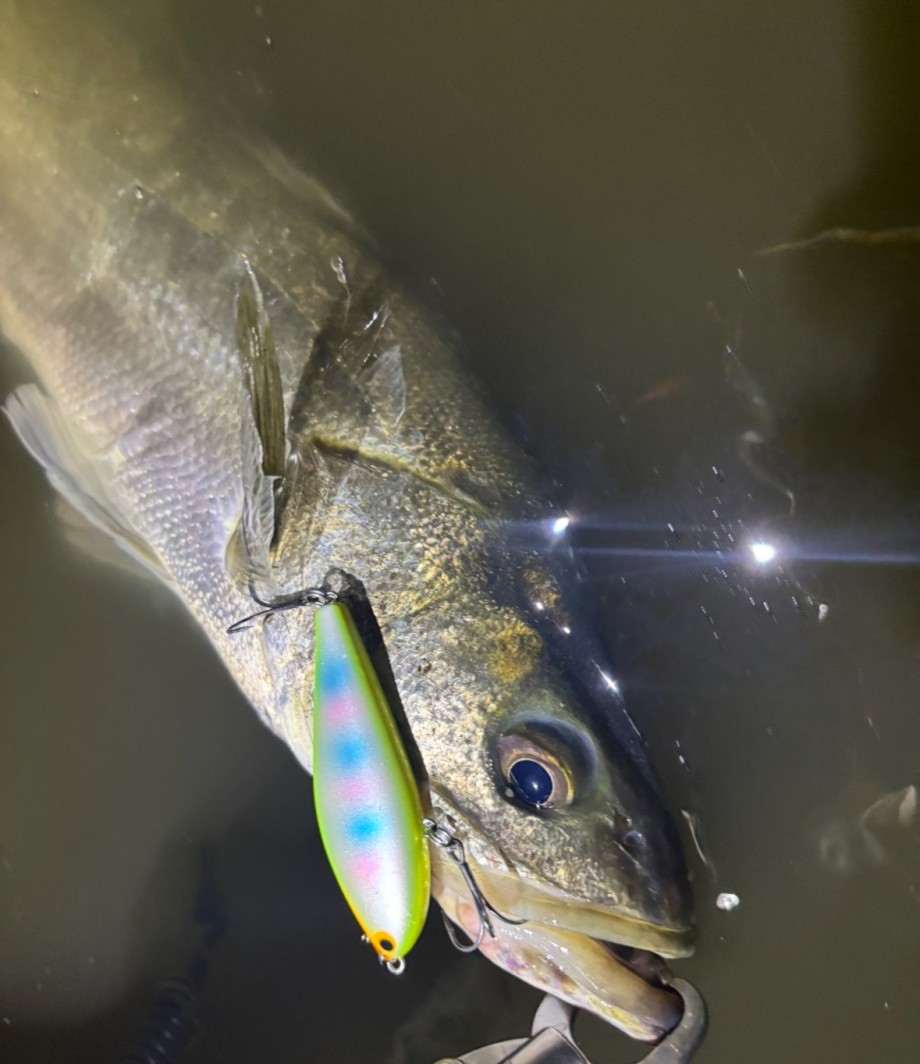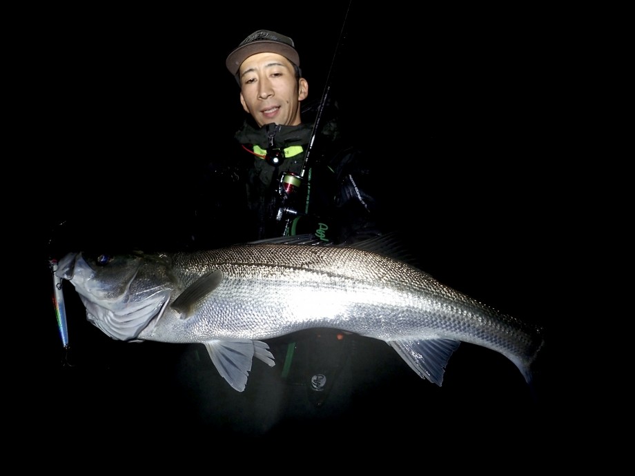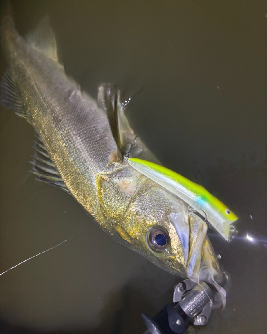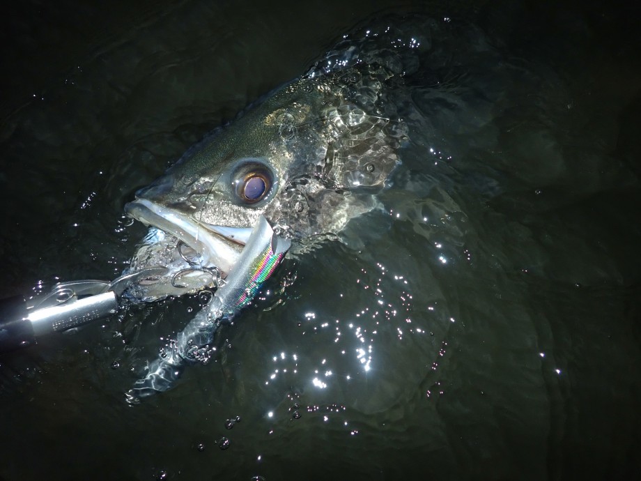 上げ潮でベイトの動くタイミングでヒットしたシーバス。表層でのバイトだ。