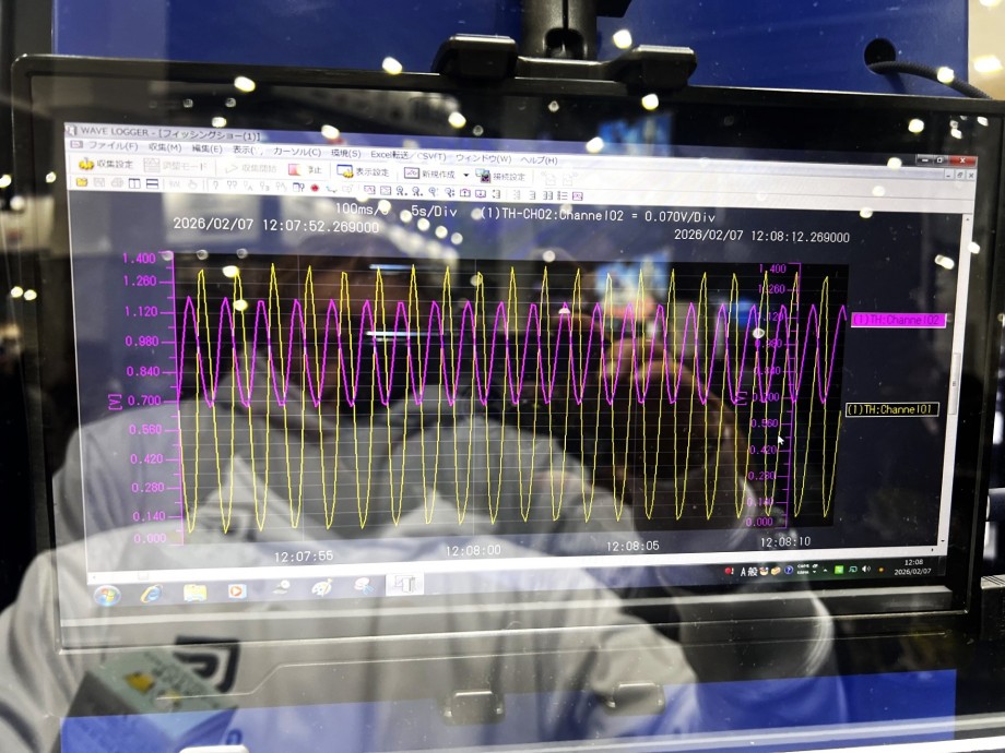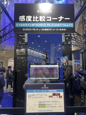 ゴーセンはフィッシングショー大阪のみの出展だったのだが、この時その弾性率の高さと感度が体感できる装置を展示していた。