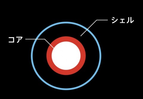 その断面構造を見ると芯(コア)となる糸が中央にあって、その周りを8本撚りのPEが鞘のように取り囲む構造(シェル)になっている。
