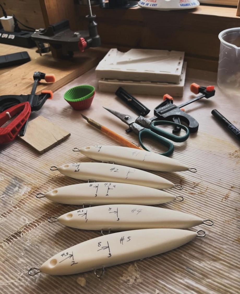 どちらのスピードでも結果ヒラマサは釣れるのだから、メタルジグを引っ張るくらいのリーリングでアクションが成立するトップウォータープラグを作ってみたら面白いんじゃないか?という事で試作を開始しました。