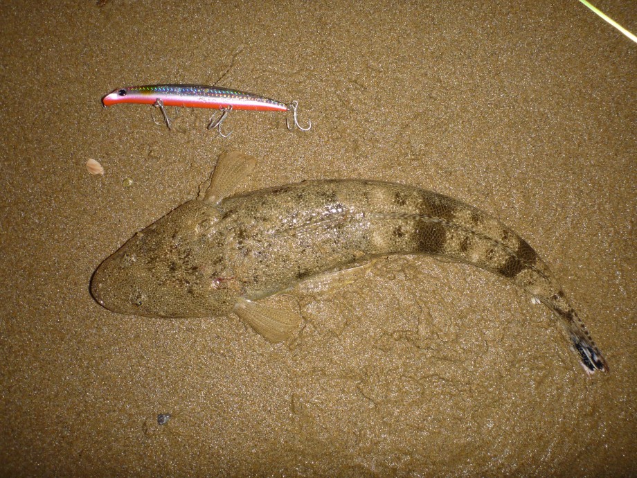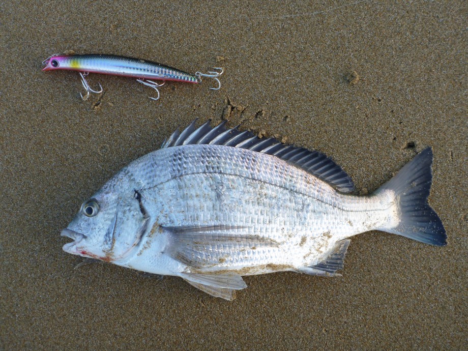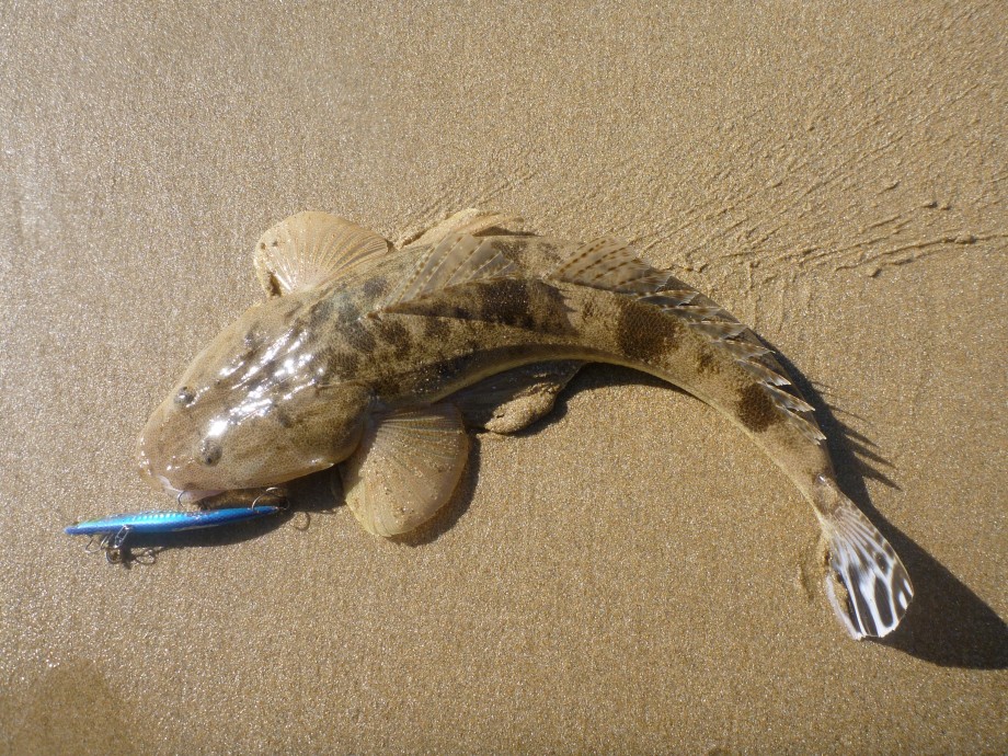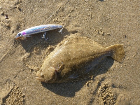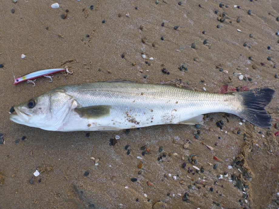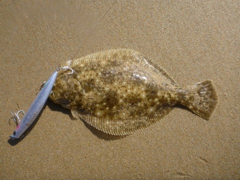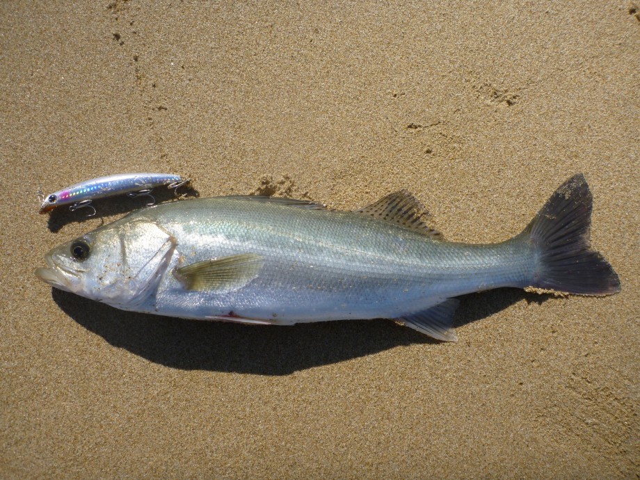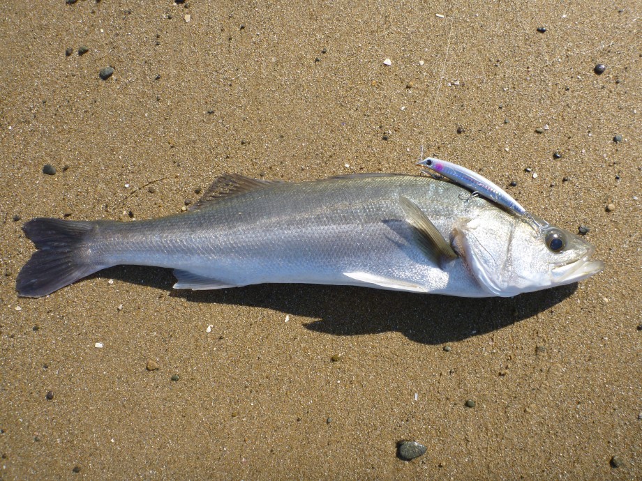 ベタ凪の状態で波もなくブレイクなどが探しにくい為に、砂底に変化がある所は定期的にカレント(離岸流)が発生するので、そこに魚が待機しているだろうと想定しルアーを通すと答えは出ました。