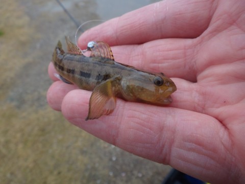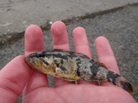 その後も同じように堤防に取り付けられている梯子を沿わせるようにしてJHを落としていき、スレ掛かりですが10cm程のアナハゼを釣りました。