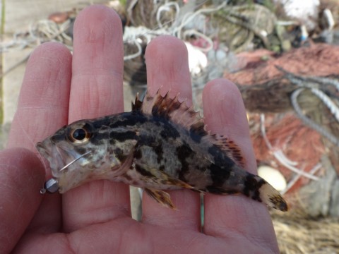 同級生も0.6号の中通しオモリを使ったキャロライナリグにマルキューのパワーイソメを付けてロープを探って5センチ程のタケノコメバルや、係留してある船の間を探って20センチ程のマハゼを釣っていました。