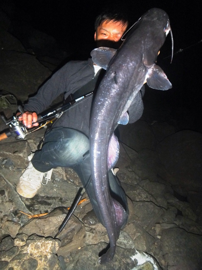 絶対釣れ るだろうというラインを流した友人にヒットしたビワコオオナマズ。