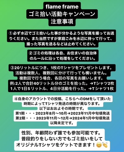 最後になるが、今もなお全国各地の釣り場で騒がれているであろうゴミ問題に対し、私は私なりの戦い方で釣り場を守っていく努力をする所存である。「flame frameごみ拾いキャンペーン」でTシャツGETの条件である20Lという量のゴミを水辺で拾うのはなかなか大変なため、ぜひお友達を誘って皆でワイワイやりながらごみ拾いをしてもらえたら幸いである。