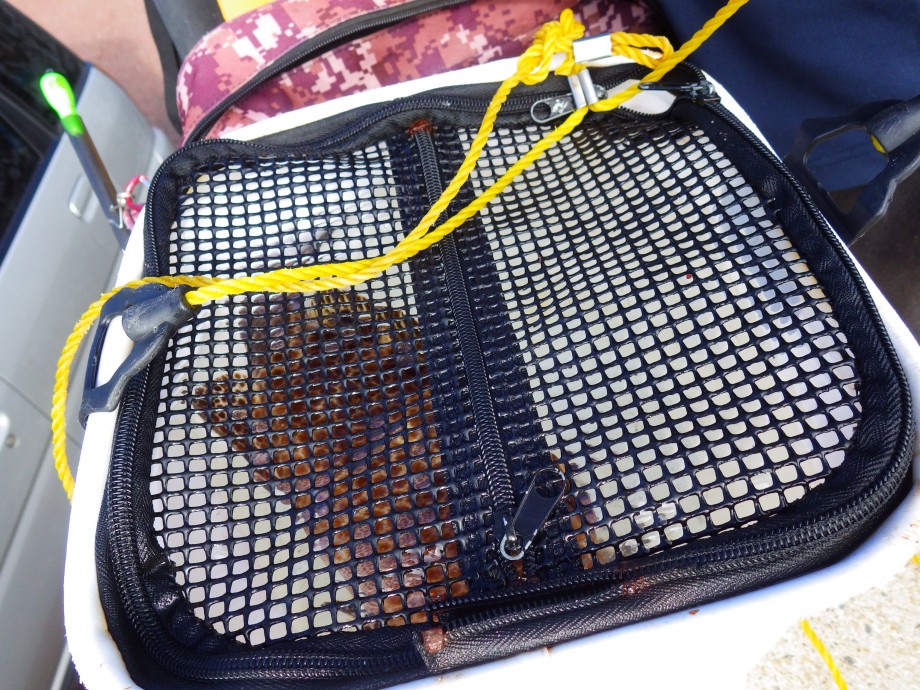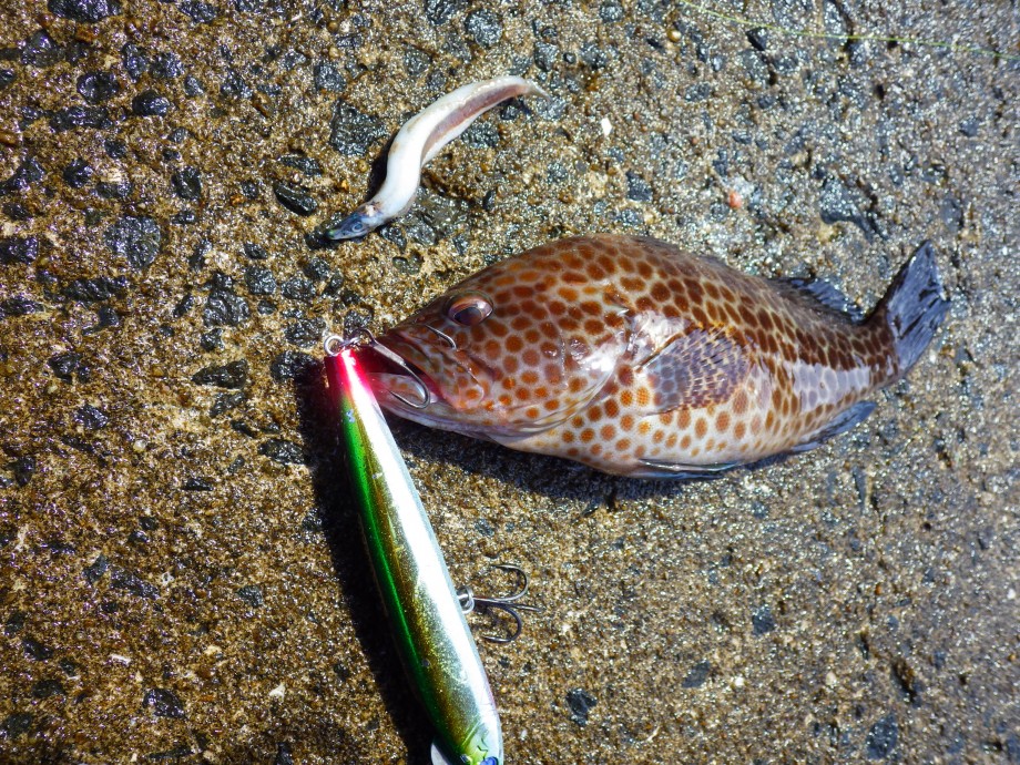 ハタの上に並べてる白いのは、この子が吐きだしたベイト。