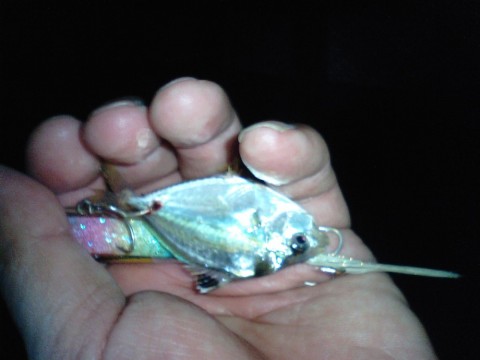 その後 キャストすれど音沙汰なしが続き ん?ゴミ?って感じで巻き上げれば フックにおまけのようにベイトさんが掛かってきました しっぽのほうにグサッって感じ。。逃がしたけど何かの腹の中に行くんだろうなぁ
