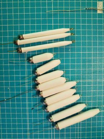 ぎりぎりサスペンド、ゆっくり沈むもの、早く沈んで底で立つものの3種類を作る。ヒートンを入れるのでサスペンドのものも、海水で沈んでくれるハズ。