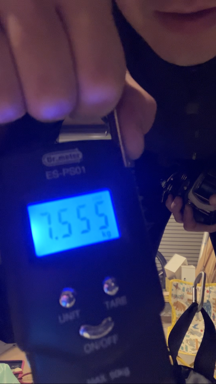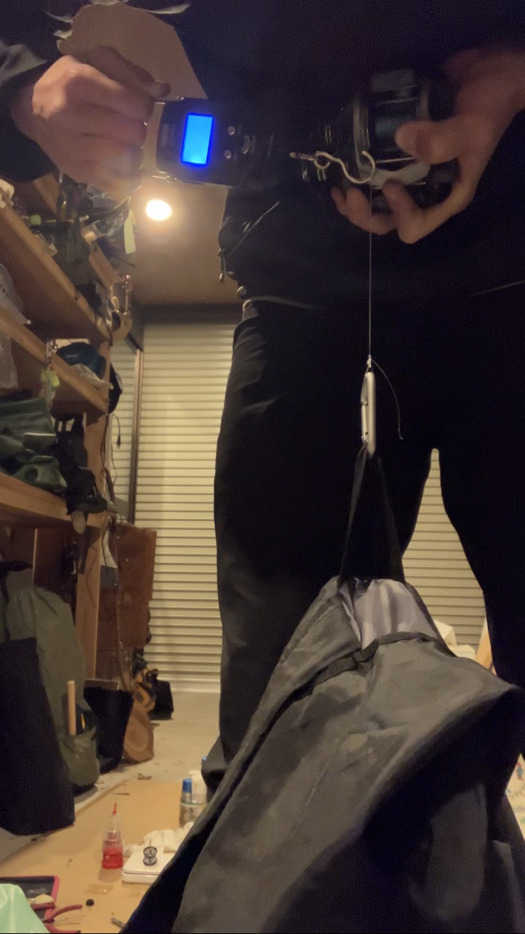 おもりを吊るします。レベルワインダーには糸を通しません。そこから反対側にレベルワインダーがあると仮定し、その位置で糸と垂直方向にデジタルばかりで引っ張ってみます。