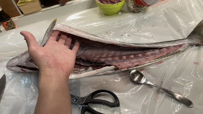肉抜きのときに、背中と皮を切らないバージョンの3枚おろしをし、若干残った肉はスプーンでそぐのですが、結構上手くできました。