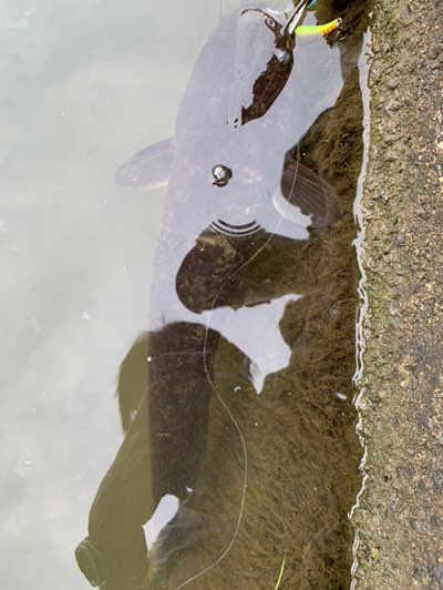 現場に到着するといるよいるよナマズさん。クランクだと浅いしメガバスさんのマーゲイswを投げてナマズの目の前でトゥイッチいれたら食ってくるという理想的な展開を頭で描きつつその通りに通すと
