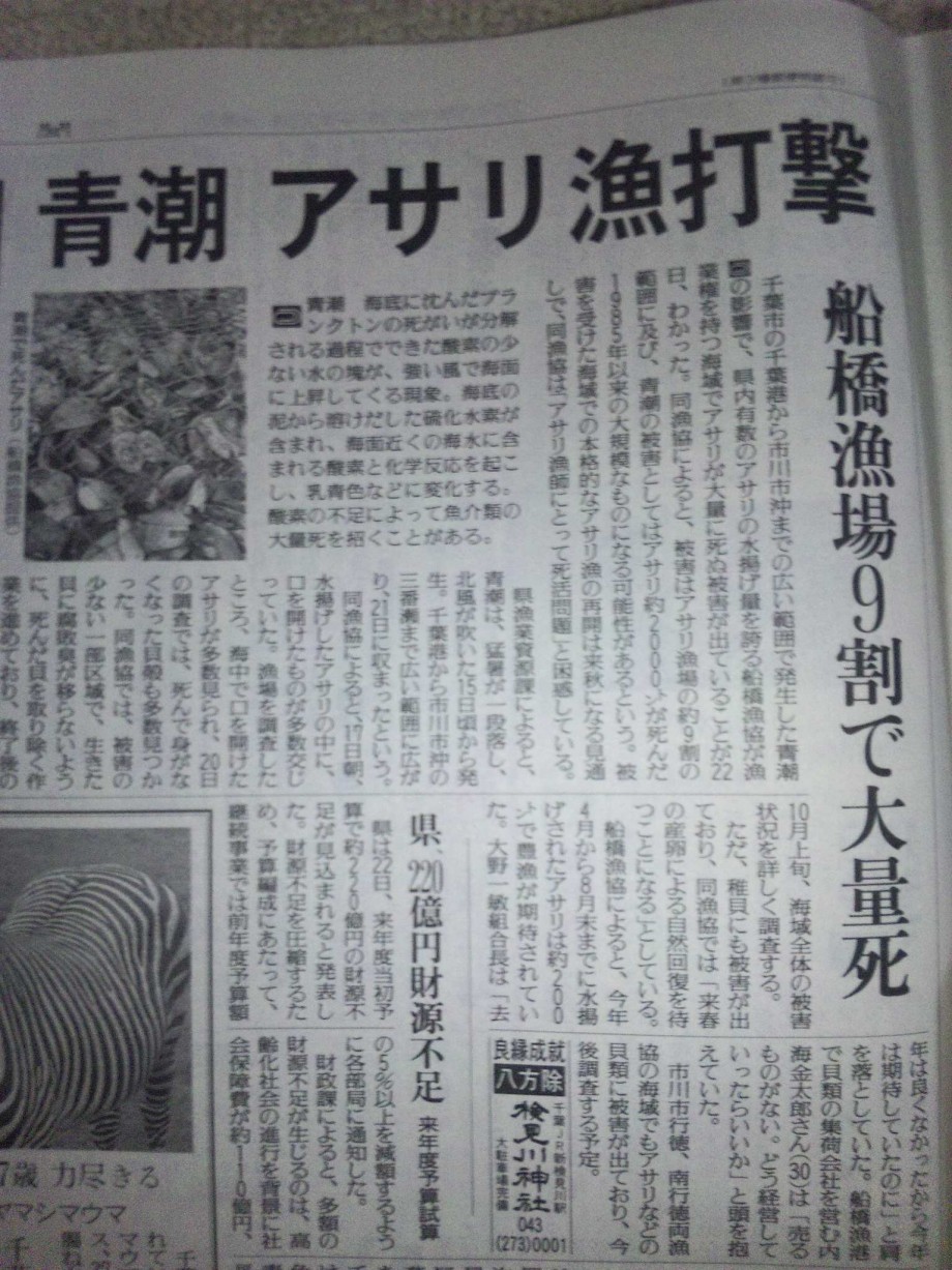 自分の家は千葉県の船橋市にあり、読売新聞をとっております。その中に地域のページがあるのですが、その中に「青潮アサリ漁打撃」という記事がありました。