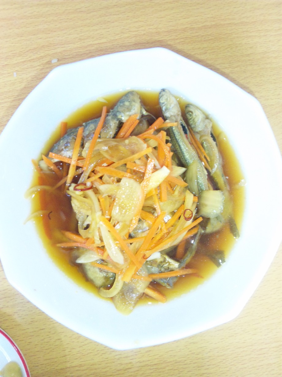 これは内臓をとってから頭をつけたまま低温の油でじっくり揚げて(10分くらい)一度取り出し、今度は高温の油で一気に揚げる。(二度揚げですね)