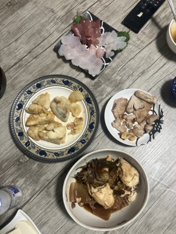 先週から熟成させてたアカハタ、今朝獲れのクエと真鯛、先日釣って冷凍してたキハダマグロのお刺身(真鯛はもらいもの)