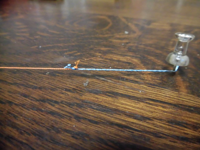 下にリーダー用のチチ輪を作り、頭にPEラインで竿への連結糸を結びます。