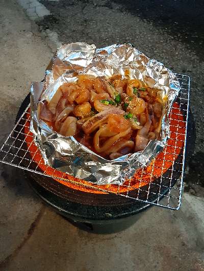 車を外に出して、雨のあたらない車庫の入り口で七輪に炭火を起こしイカとビール(発泡酒)で一人作戦会議!