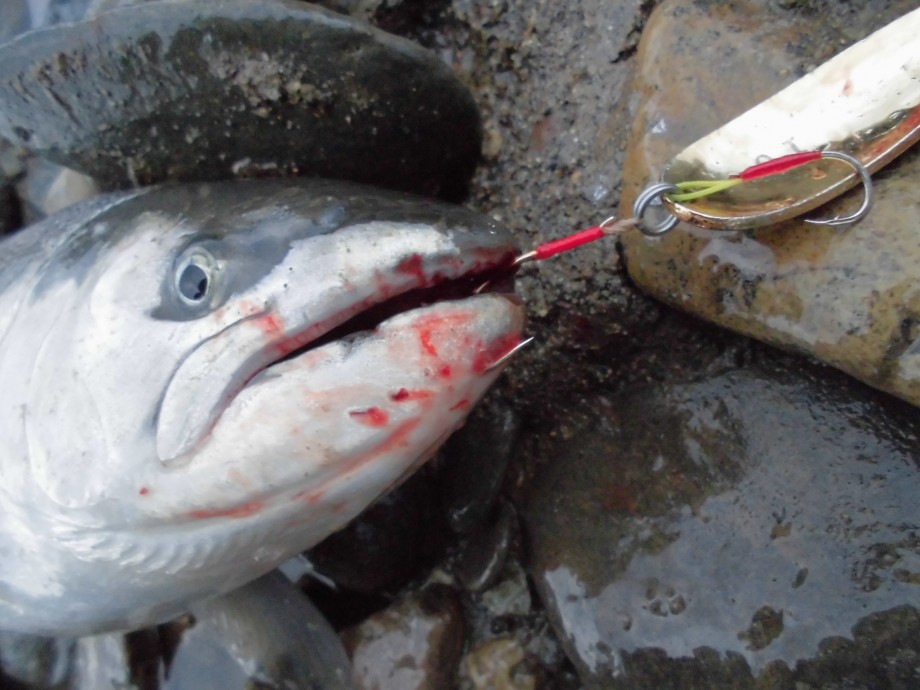{ドンドンッ}とアタリが来ました。まさかのスプーンに替えて第1投めでのヒットでした。焦らずゆっくりファイトしていたのですが、ファイト中に心配な事が1つ有りました。スプーンに天国針を2本付けていたのですが、1本は10年以上前の自作天国針で強度が心配でした。