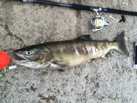 が全体で3本と全然釣れる気がしなく、悔しいので帰り際小樽の勝納川河口を除くと結構な数の鮭が泳いでるので少しやることに。