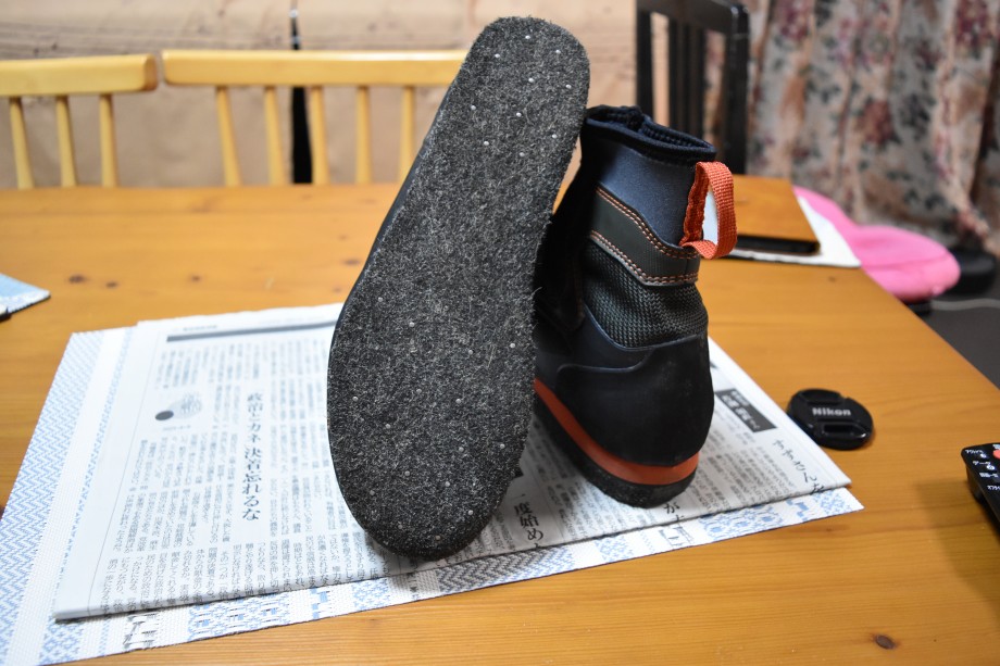 モンベルの釣り用シューズには何種類かのウェーディングシューズや沢遊び用などのシューズがありますが、モンベル製品で唯一のフェルトスパイク底のシューズがこれです ポリプロピレン製のフェルトと滑り止めのステンレスピン仕様となってます(昨年末に出たばかりの新製品です)