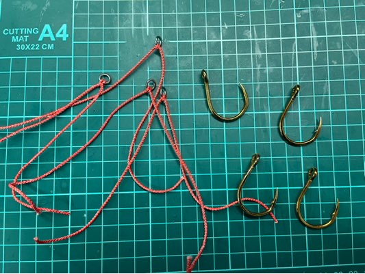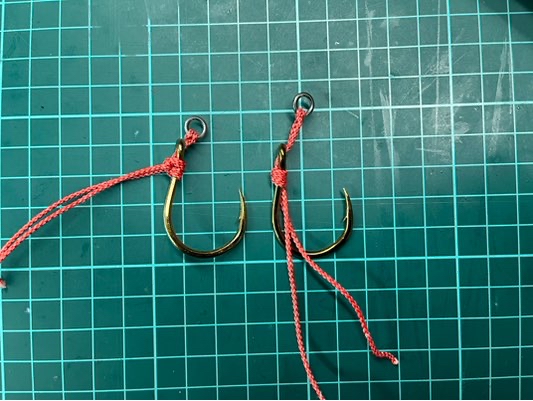 管付きフックにアシストラインを結ぶ場合、どうしても締め込む際の締め代が必要になるのでチモト(ラインアイ)と溶接リングの間に距離が開いてしまうと言う話。