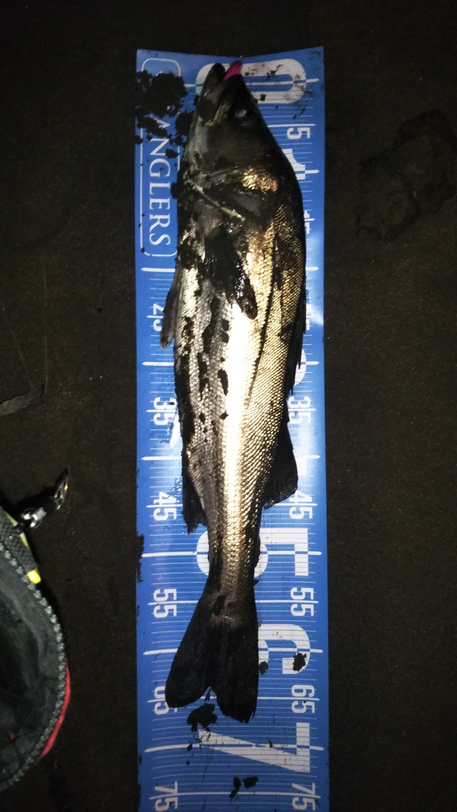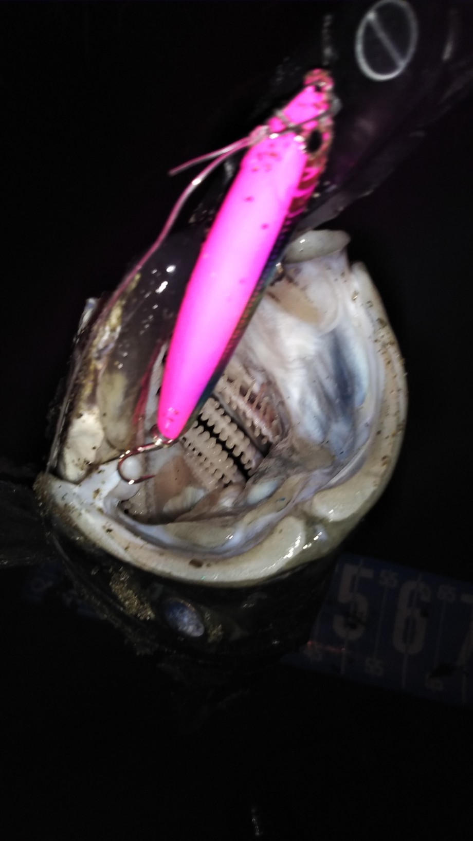中層でアタリがなかったので着水後にすぐに巻き出し、竿を垂直に立てて表層付近を巻いてワンダーの引き抵抗を感じるか感じないぐらいで巻き、流れが強くなったところで竿だけをゆっくり倒して、ラインを張ったままで明暗に流し込むと入ったぐらいでグン!