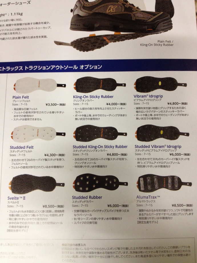 別売りのソールがピンの数違いのフェルトやビブラムで9種類。