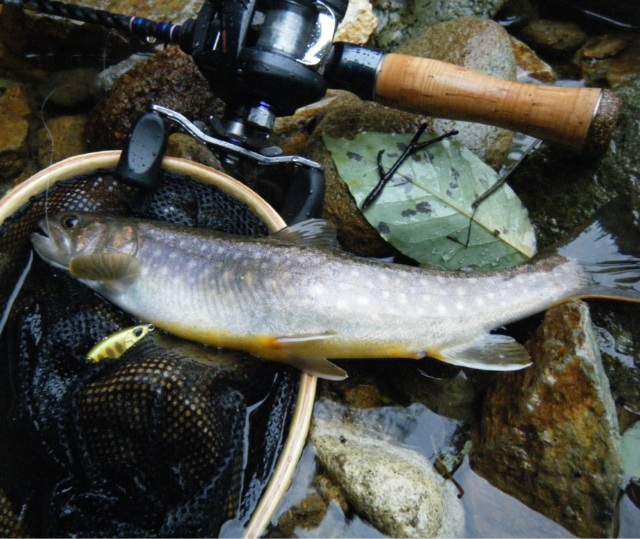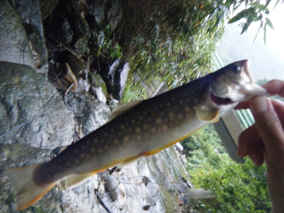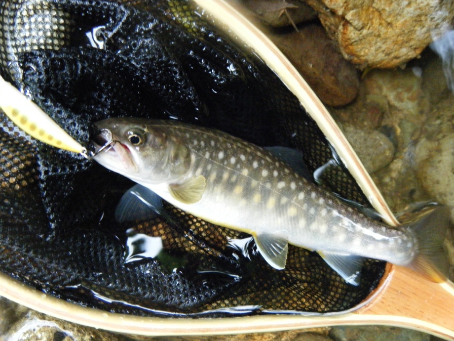 川が浅く、引きシロが取れないので1投目で誘い出し、2投目で食わせる作戦で、
