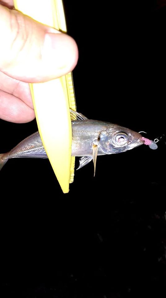 ワームサイズは小さめで食ってくる・・・・画像はDUOのTETRA WORKS メガロバ+JACKALL アジマメヘッド0.4gのセットでキャストしてラインスラッグを取ってからのシェイク→ステイ→フォール→ヒット・・・・といった理想的なパターンで食わせれた豆アジ。