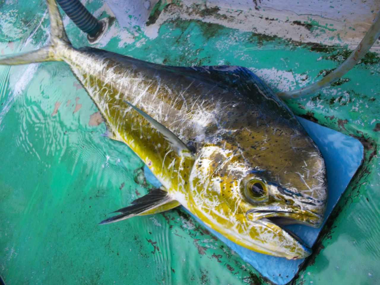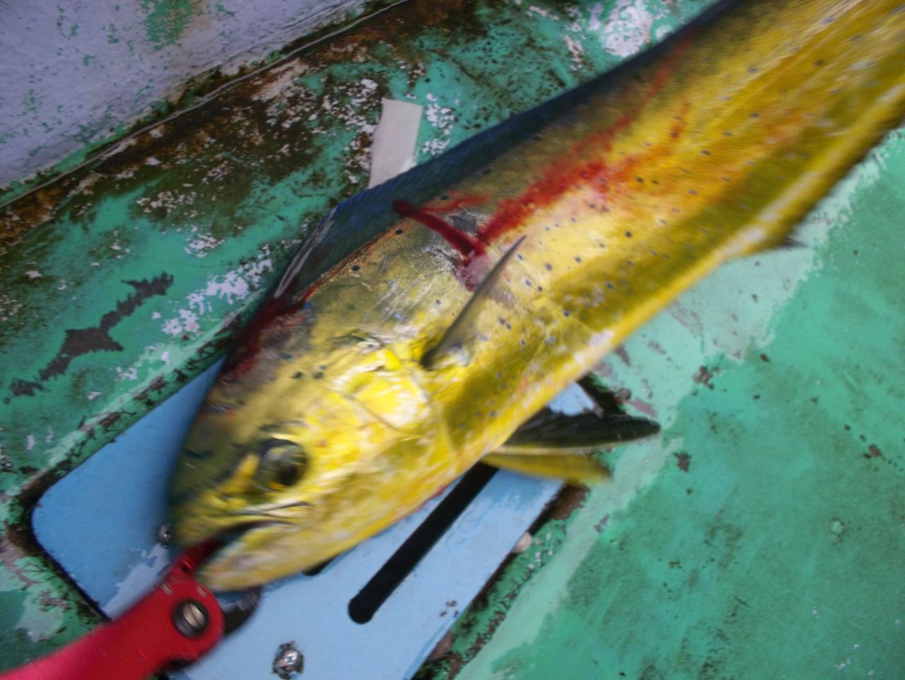 そのファイトにシイラが興奮したのか、数匹の群れが船のまわりに回ってきた。