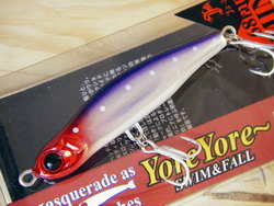 従来のヨレヨレよりも、全長で約12mm、ウエイトで約4gダウンサイジング。小場所で、マッチザベイトで、フォールスピードの変化で、リフトの速さで、ヨレヨレオリジナル(従来品80mm、17g)とのローテーションが可能です。