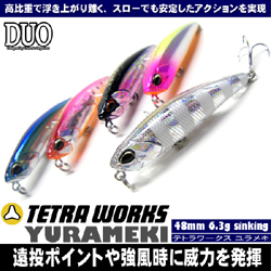 ユラメキは全長48mm・重量6.3gの高比重ボディが生み出す圧倒的なキャスト性能を備えるシンキングペンシル。遠投ポイントや強風下はもちろん、広範囲を効率よ探るサーチベイトとしても威力を発揮します。また、高比重ボディは飛距離だけでなく、シンキングペンシルの欠点であるボディの浮き上がりを抑え、幅広いレンジ調整を可能とします。スローリトリーブでテールをユラユラと振る艶めかしいアクションは、メバルなどの小物だけでなく、ハイプレッシャー下のスレたシーバスにも効果的です。